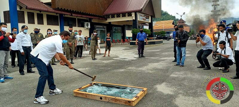 Bupati Tapteng Bakhtiar Ahmad Sibarani saat memusnahkan barang bukti judi jacpot dan judi tembak ikan. (batakpost.com/RED)