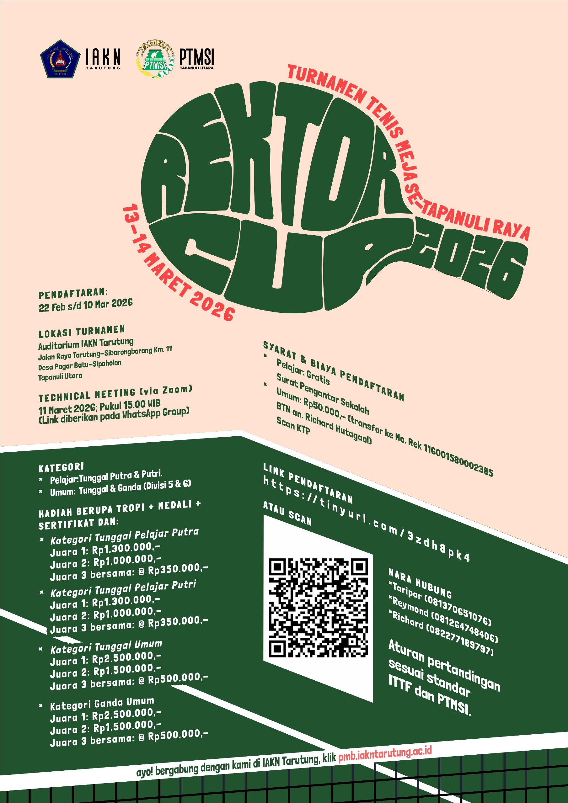 “Untuk kategori pelajar baik putra dan putri biaya pendaftaran gratis, cukup membawa surat pengantar dari sekolah. Sedangkan untuk kategori umum, membayar uang pendaftaran Rp 50.000 ditambah dengan scan KTP peserta. Itu saja syaratnya,” sebut Taripar, Rabu (25/2/2026).
