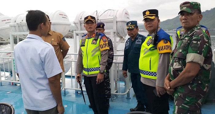 Kapolres Sibolga AKBP Taryono bersama Forkopimda saat melakukan peninjauan dan pengecekan kapal dalam rangka pengamanan mudik Lebaran 2023 dari Sibolga menuju kepulauan Nias, Selasa (18/4/2023). (Batakpost.com/Humas Polres Sibolga)
