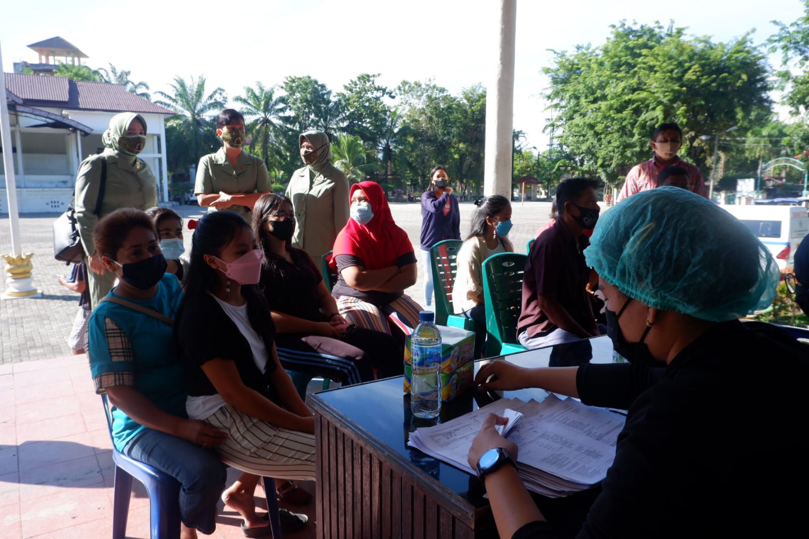 Sibolga, 28/7 (Batakpost.com)- Ketua Persit KCK Koorcabrem 023 PD I/BB Ny. Ina Febriel Sikumbang, didampingi Ketua Persit Cabang XLIV Dim 0211 Koorcab Rem 023, Ny Nurul Dadang Alex meninjau pelaksanaan Serbuan Vaksinasi Massal kepada masyarakat yang bertempat di Lapangan Simaremare, Kota Sibolga, Rabu (28/7/2021).