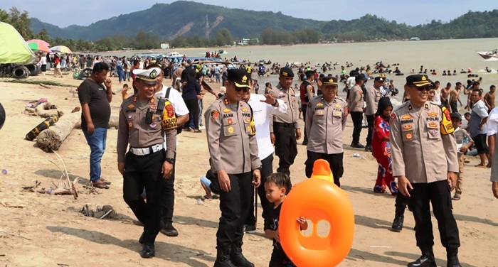 Terpantau di Pantai PIA Hotel dan Ikan Bakar Roy Pandan, Kapolres Tapteng AKBP Muhammad Alan Haikel bersama jajaran turun ke lokasi untuk memantau situasi pegunjung sekaligus mengimbau pegunjung untuk tetap waspada dan menggunakan pelampung saat bermain air.