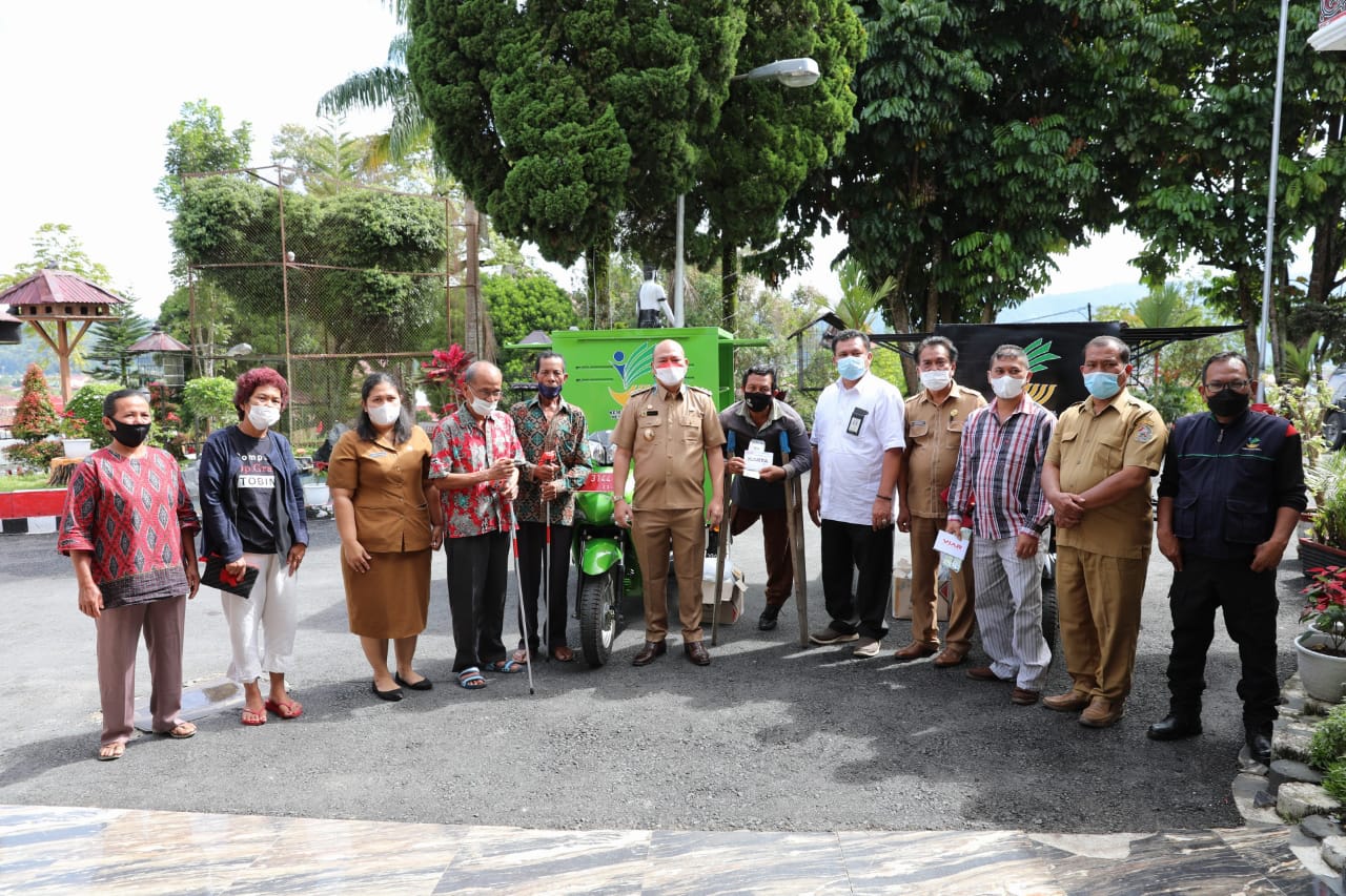 Bupati Taput, Nikson Nababan foto bersama dengan penyandang disablitas usai menerima bantuan dari Kemensos RI yang diserahkan langsung oleh Bupati. (batakpost.com/Ril)