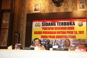 Kapolda Sumut dalam sambutan yang diwakili oleh Wakapolda Sumut menyampaikan terimakasih kepada seluruh peserta seleksi yang telah mengikuti seluruh tahapan seleksi dengan baik sesuai dengan pentahapan seleksi yang telah ditetapkan. Wakapolda Sumut juga mengucapkan terimakasih kepada para orang tua peserta seleksi dan Panitia Pelaksana serta pengawas Eskternal dan Internal yang turut mensukseskan proses seleksi penerimaan Bintara Polri 2017 ini hingga berjalan dengan baik hingga penetapan kelulusan.