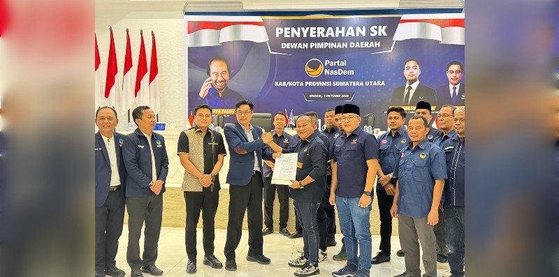 Medan, 14/10 (Batakpost.com)- Rahmansyah Sibarani, SH., MH, resmi menerima Surat Keputusan (SK) DPD NasDem Kabupaten Tapanuli Tengah dari DPP Partai NasDem yang diserahkan Ketua DPW NasDem Sumut, Iskandar di Medan, Selasa (14/10/2025).