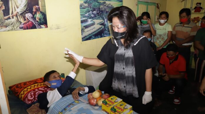 Satika Nikson Nababan br Simamora saat melakukan kunjungan kasih kepada warganya yang menderita kelumpulah selama 28 tahun. (Ist)