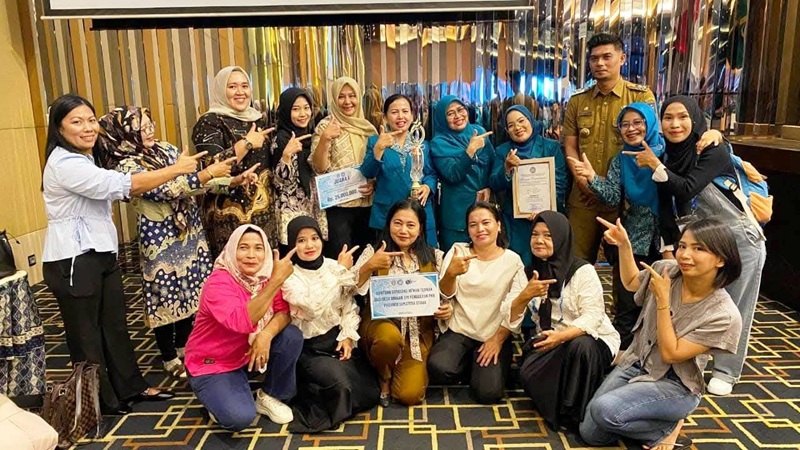 Wakil Ketua Tim Penggerak Pemberdayaan dan Kesejahteraan Keluarga (TP PKK) Kota Sibolga, Ny. Lumsedia Pantas Lumbantobing foto bersama dengan Lurah Pancuran Pinang dan juga TP PKK Kelurahan atas prestasi Kelurahan Pancuran Pinang keluar sebagai Juara I Lomba Asuh Anak dan Remaja (PAAR) Tingkat Sumatera Utara. (Batakpost.com/Ist)